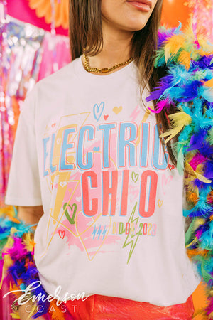 Introducing the Chi Omega Bid Day Electric Colorful Tee! Get ready to light up your bid day in this ultra-colorful tee that's got all the colors of your dreams - lots of pink, red, blue, green and yellow. Plus, we've added 'Electric Chi O' for an extra spark of style. The fun block font has outlines and shadows to really make it stand out, and it's finished off with a big yellow lightning bolt and a collection of smaller ones around it. For bid day 2023 there's no better look than this vibrant shirt. For current Chi O sisters, this tee will make any occasion one to remember. Rock your way through bid day in style!