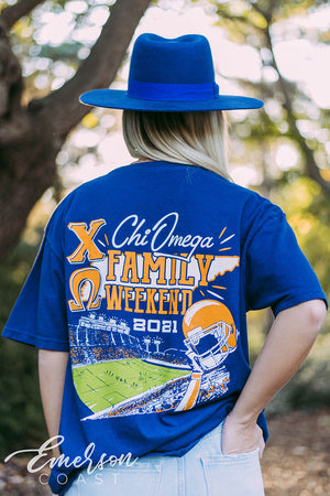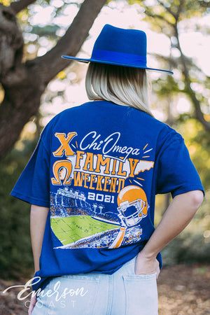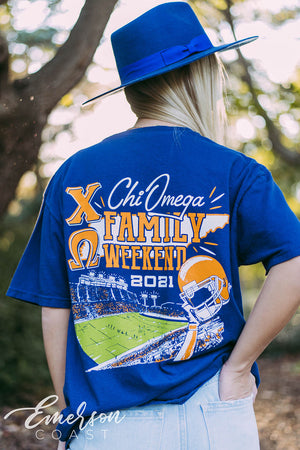 Show your spirit with the Chi Omega Family Weekend T-Shirt!