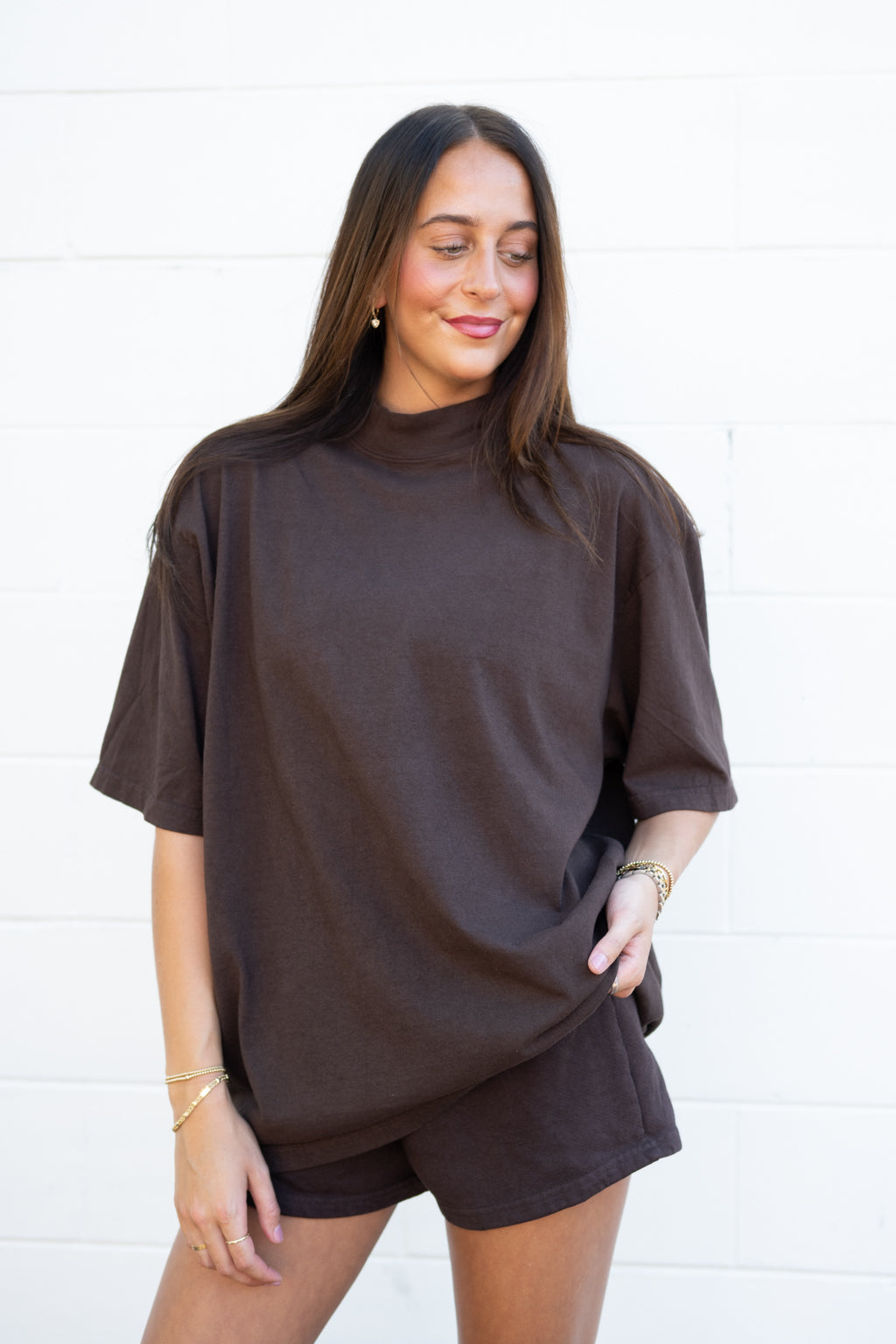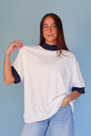 The Vibe: Effortless slouchy style mock neck ringer tee