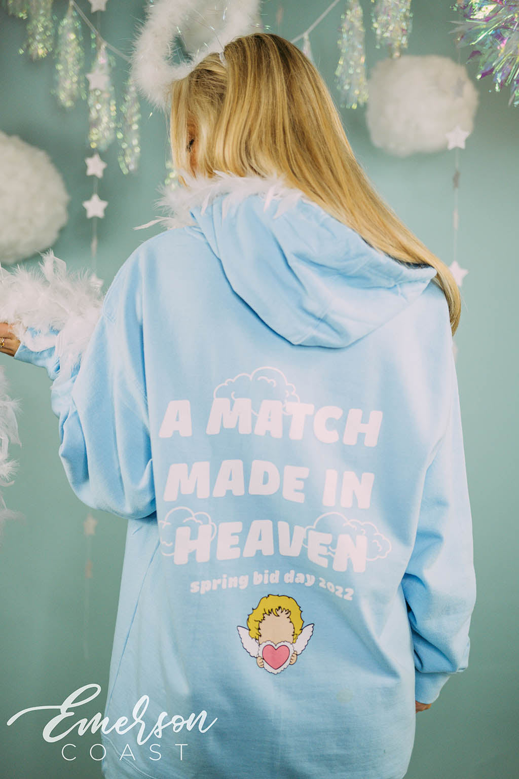 The back design features the phrase "match made in heaven," with clouds and Cupid scattered around.