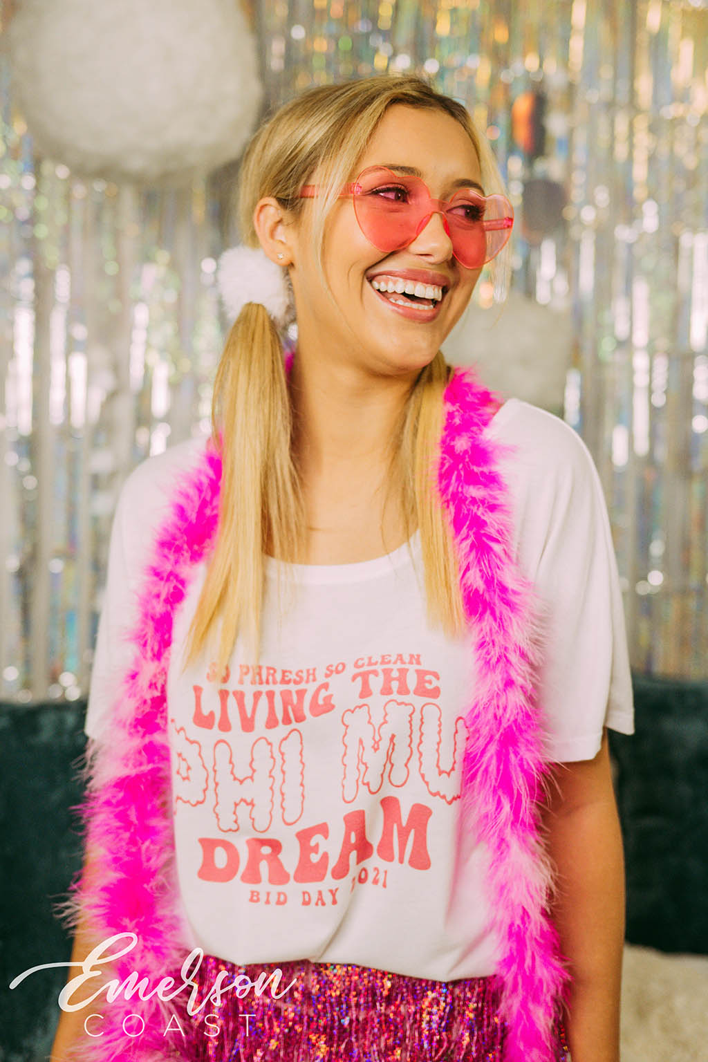 Add some pop with a feather boa and shaped sunnies!